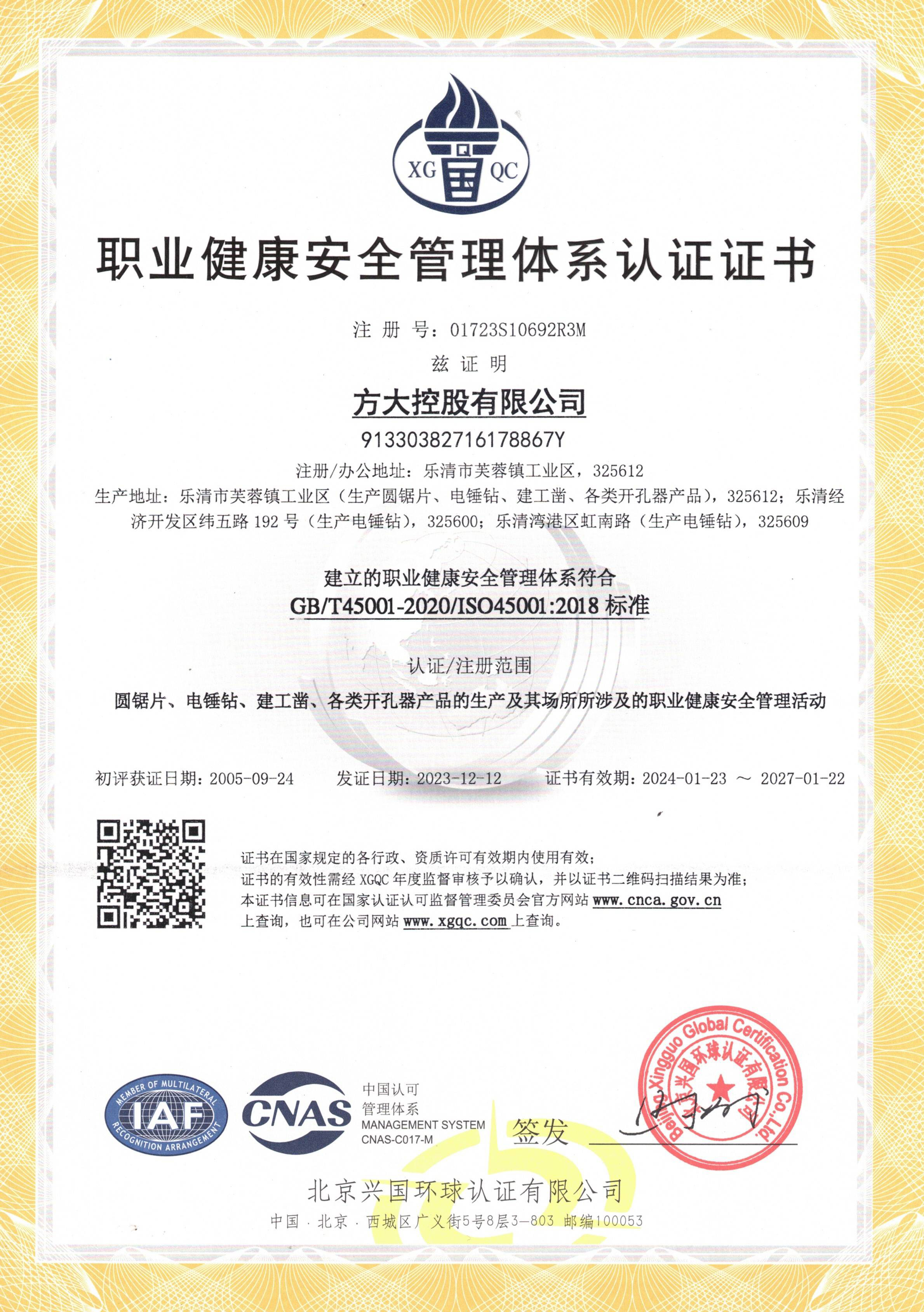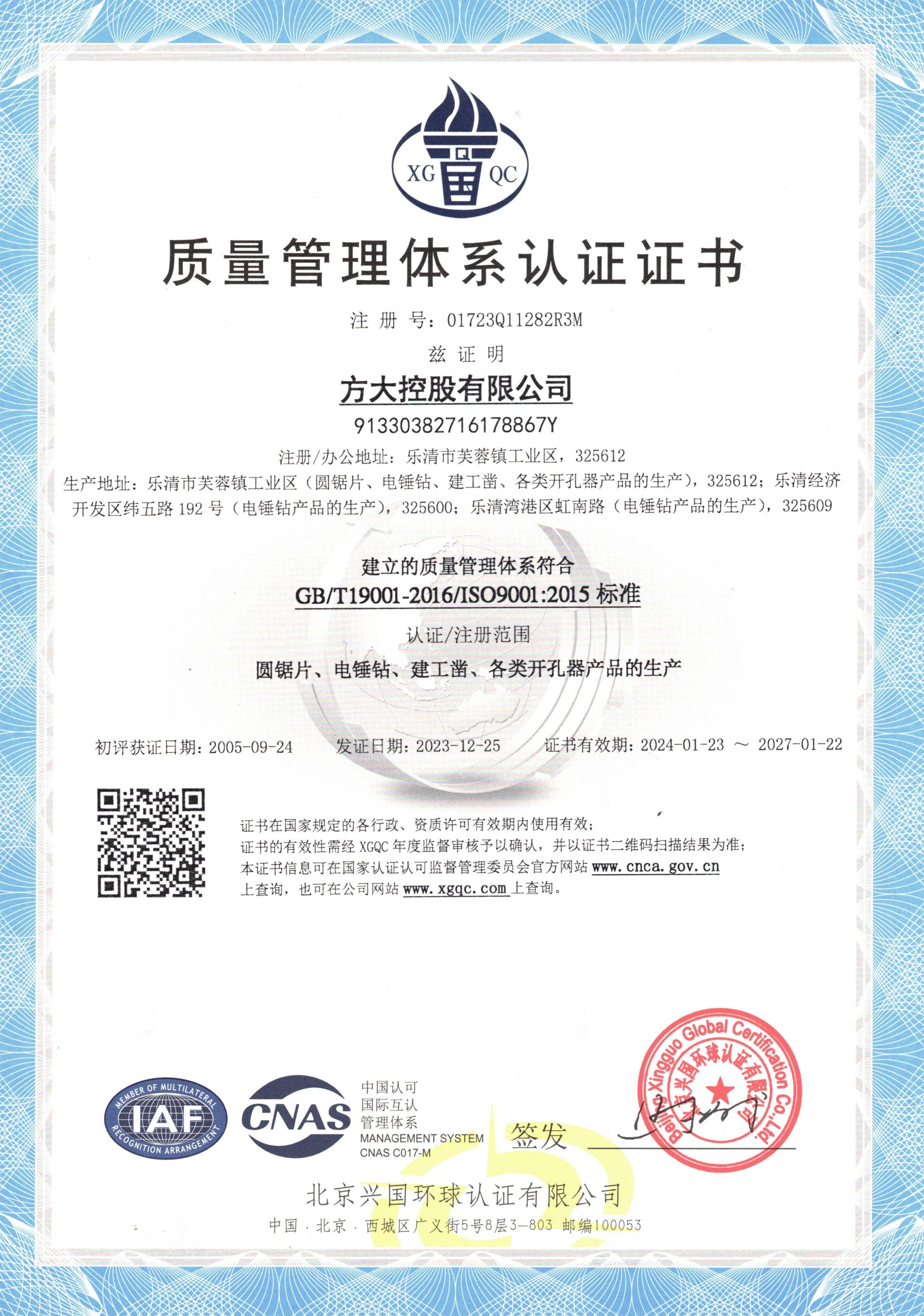 科技與質(zhì)量的創(chuàng)新是方大發(fā)展的另一大“主題”。公司擁有雄厚的技術(shù)力量,完善的檢測試驗(yàn)設(shè)備,先進(jìn)的經(jīng)營管理理念。在樂清市同行業(yè)中率先通過ISO9001質(zhì)量管理體系、ISO14001環(huán)境管理體系和OHSAS18001職業(yè)健康安全管理體系認(rèn)證、SA8000社會(huì)責(zé)任管理體系、錘鉆歐洲認(rèn)證委員會(huì)(PGM)認(rèn)證。